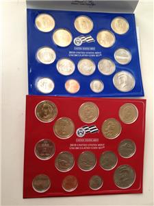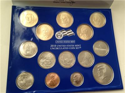 This 28pc Uncirculated Coin set includes: 2010 P/D Dollars: Sacagawea and her infant son; Millard Filmore; Franklin Pierce; James Buchanan; 2010 P/D John F. Kennedy Half Dollar; 2010 P/D Washington Quarters issued for the State of Arkansas, Arizona; California; Oregon and Wyoming; 2010 P/D Roosevelt Dime; 2010 P/D Washington Nickel; and 2010 P/D Lincoln Penny with total face value of $13.82. The blue pack of 14 uncirculated coins were minted in Philadelphia and the red pack of 14 uncirulated ones were minted in Denver Colorado. It is in mint Condition with Certificate of Authenticity as shown in Photos. I have 3 sets available for sale.